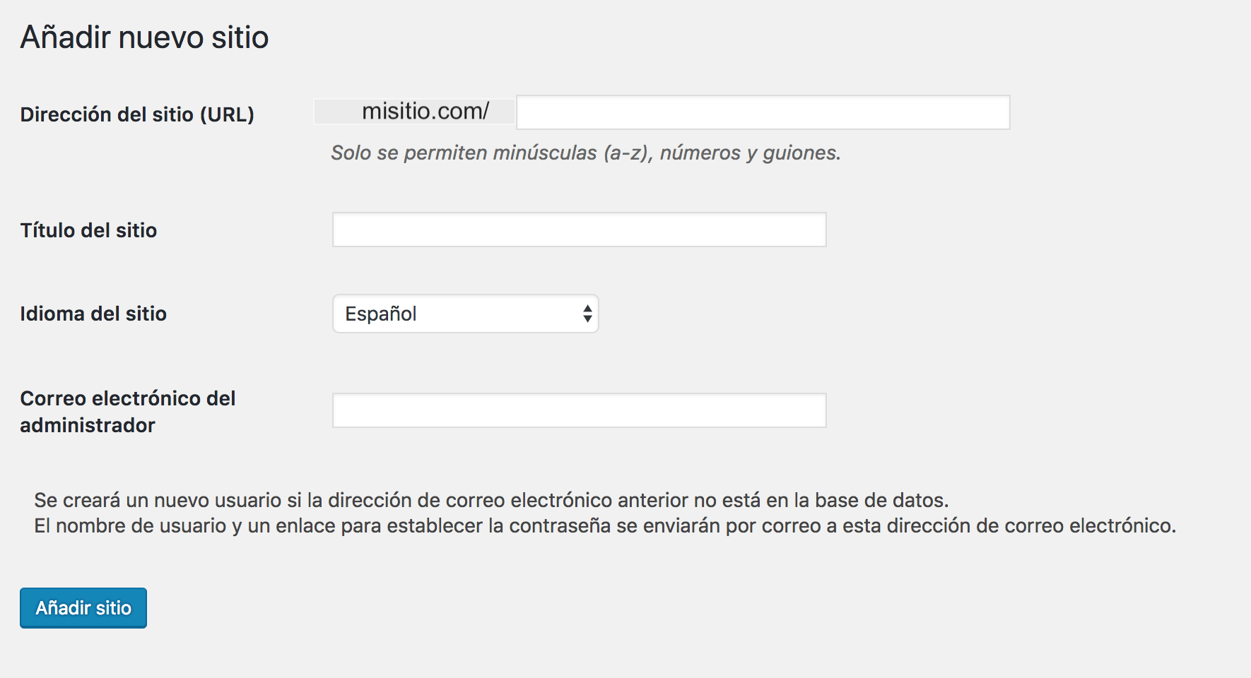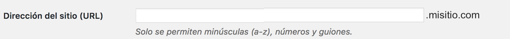 Como en este caso hemos elegido crear el multisite de WordPress como un sub-directorio, nos da la opción de elegir el nombre del sitio justo después del dominio. Si hubieras elegido sub-dominio la opción de poner la url estaría justo delante, seguida de un punto y del dominio